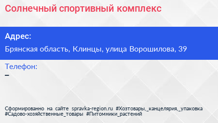 Солнечный, спортивный комплекс по адресу Брянская область, Клинцы, улица Ворошилова, 39 в дальнейшем Организация, размещена в следующих категориях: