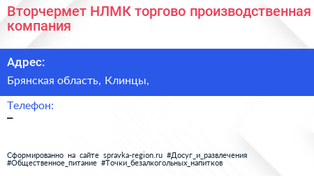 Вторчермет НЛМК, торгово-производственная компания по адресу Брянская область, Клинцы, в дальнейшем Организация, размещена в следующих категориях: