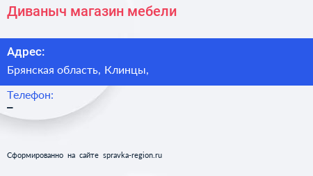 Диваныч, магазин мебели по адресу Брянская область, Клинцы, в дальнейшем Организация, размещена в следующих категориях: