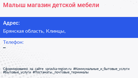 Малыш, магазин детской мебели по адресу Брянская область, Клинцы, в дальнейшем Организация, размещена в следующих категориях: