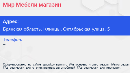 Мир Мебели, магазин по адресу Брянская область, Клинцы, Октябрьская улица, 5 в дальнейшем Организация, размещена в следующих категориях: