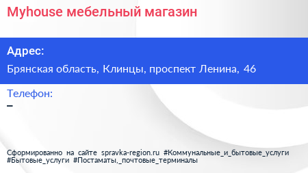 Myhouse, мебельный магазин по адресу Брянская область, Клинцы, проспект Ленина, 46 в дальнейшем Организация, размещена в следующих категориях: