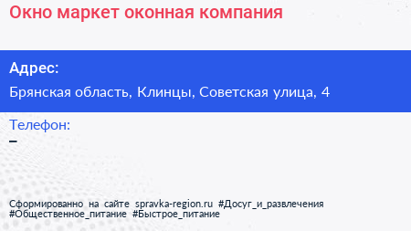 Окно маркет, оконная компания по адресу Брянская область, Клинцы, Советская улица, 4 в дальнейшем Организация, размещена в следующих категориях: