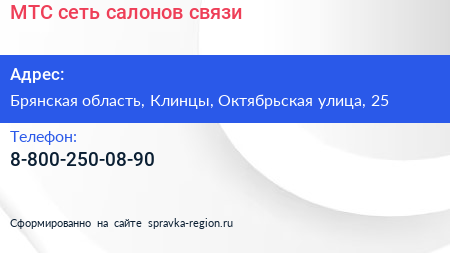МТС, сеть салонов связи по адресу Брянская область, Клинцы, Октябрьская улица, 25 в дальнейшем Организация, размещена в следующих категориях: