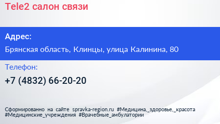 Tele2, салон связи по адресу Брянская область, Клинцы, улица Калинина, 80 в дальнейшем Организация, размещена в следующих категориях: