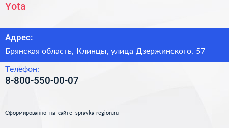 Yota по адресу Брянская область, Клинцы, улица Дзержинского, 57 в дальнейшем Организация, размещена в следующих категориях:
