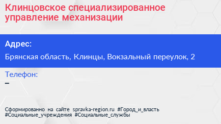 Клинцовское специализированное управление механизации по адресу Брянская область, Клинцы, Вокзальный переулок, 2 в дальнейшем Организация, размещена в следующих категориях: