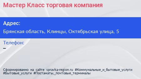 Мастер-Класс, торговая компания по адресу Брянская область, Клинцы, Октябрьская улица, 5 в дальнейшем Организация, размещена в следующих категориях: