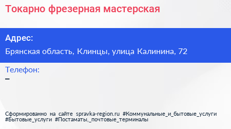 Токарно-фрезерная мастерская по адресу Брянская область, Клинцы, улица Калинина, 72 в дальнейшем Организация, размещена в следующих категориях: