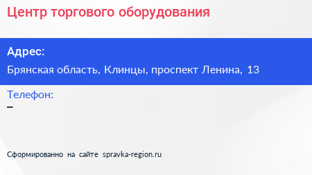 Центр торгового оборудования по адресу Брянская область, Клинцы, проспект Ленина, 13 в дальнейшем Организация, размещена в следующих категориях: