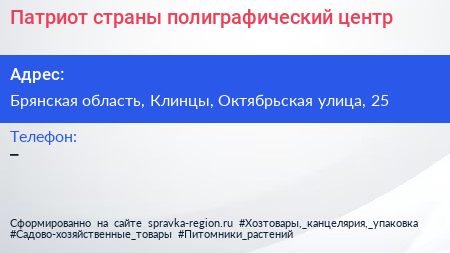 Патриот страны, полиграфический центр по адресу Брянская область, Клинцы, Октябрьская улица, 25 в дальнейшем Организация, размещена в следующих категориях: