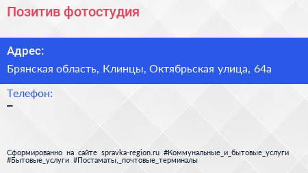 Позитив, фотостудия по адресу Брянская область, Клинцы, Октябрьская улица, 64а в дальнейшем Организация, размещена в следующих категориях: