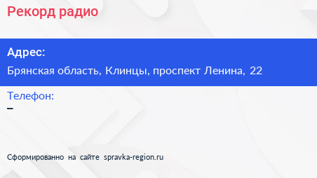 Рекорд, радио по адресу Брянская область, Клинцы, проспект Ленина, 22 в дальнейшем Организация, размещена в следующих категориях: