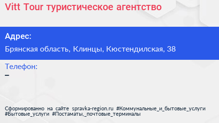 Vitt Tour, туристическое агентство по адресу Брянская область, Клинцы, Кюстендилская, 38 в дальнейшем Организация, размещена в следующих категориях: