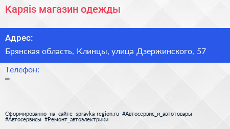 Kapяis, магазин одежды по адресу Брянская область, Клинцы, улица Дзержинского, 57 в дальнейшем Организация, размещена в следующих категориях: