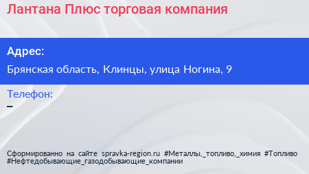 Лантана-Плюс, торговая компания по адресу Брянская область, Клинцы, улица Ногина, 9 в дальнейшем Организация, размещена в следующих категориях: