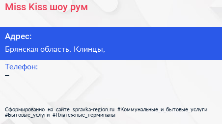 Miss Kiss, шоу-рум по адресу Брянская область, Клинцы, в дальнейшем Организация, размещена в следующих категориях:
