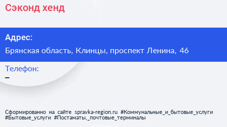 Сэконд-хенд по адресу Брянская область, Клинцы, проспект Ленина, 46 в дальнейшем Организация, размещена в следующих категориях: