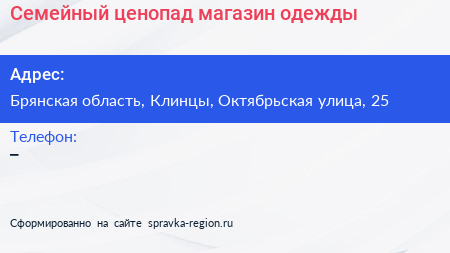 Семейный ценопад, магазин одежды по адресу Брянская область, Клинцы, Октябрьская улица, 25 в дальнейшем Организация, размещена в следующих категориях: