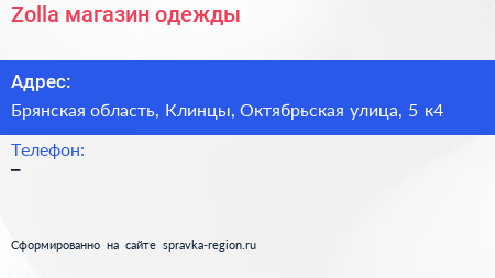 Zolla, магазин одежды по адресу Брянская область, Клинцы, Октябрьская улица, 5 к4 в дальнейшем Организация, размещена в следующих категориях: