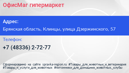 ОфисМаг, гипермаркет по адресу Брянская область, Клинцы, улица Дзержинского, 57 в дальнейшем Организация, размещена в следующих категориях: