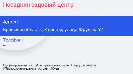 Посадкин, садовый центр по адресу Брянская область, Клинцы, улица Фрунзе, 52 в дальнейшем Организация, размещена в следующих категориях: