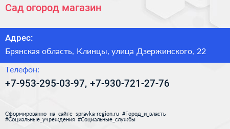 Сад-огород, магазин по адресу Брянская область, Клинцы, улица Дзержинского, 22 в дальнейшем Организация, размещена в следующих категориях: