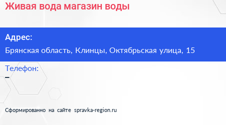 Живая вода, магазин воды по адресу Брянская область, Клинцы, Октябрьская улица, 15 в дальнейшем Организация, размещена в следующих категориях: