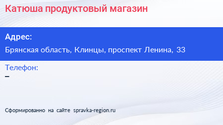 Катюша, продуктовый магазин по адресу Брянская область, Клинцы, проспект Ленина, 33 в дальнейшем Организация, размещена в следующих категориях: