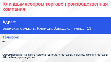 Клинцымясопром, торгово-производственная компания по адресу Брянская область, Клинцы, Заводская улица, 13 в дальнейшем Организация, размещена в следующих категориях: