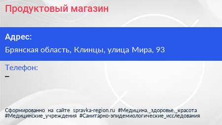 Продуктовый магазин по адресу Брянская область, Клинцы, улица Мира, 93 в дальнейшем Организация, размещена в следующих категориях: