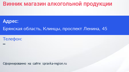 Винник, магазин алкогольной продукции по адресу Брянская область, Клинцы, проспект Ленина, 45 в дальнейшем Организация, размещена в следующих категориях:
