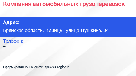 Компания автомобильных грузоперевозок по адресу Брянская область, Клинцы, улица Пушкина, 34 в дальнейшем Организация, размещена в следующих категориях: