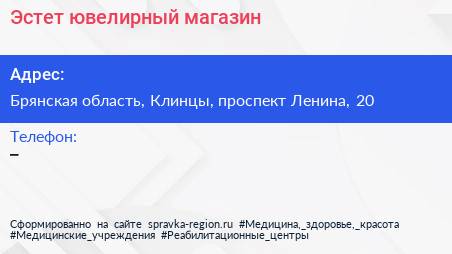 Эстет, ювелирный магазин по адресу Брянская область, Клинцы, проспект Ленина, 20 в дальнейшем Организация, размещена в следующих категориях:
