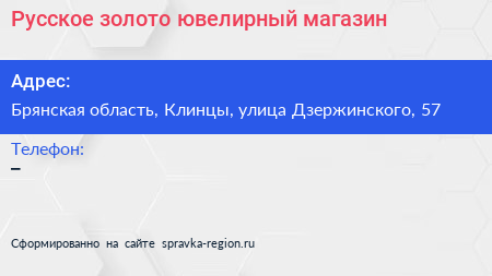 Русское золото, ювелирный магазин по адресу Брянская область, Клинцы, улица Дзержинского, 57 в дальнейшем Организация, размещена в следующих категориях: