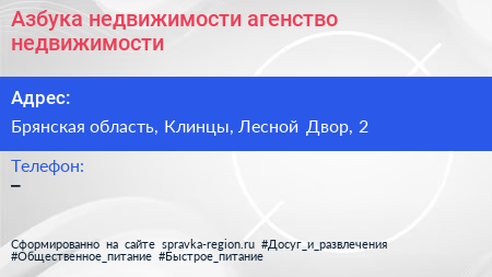 Азбука недвижимости, агенство недвижимости по адресу Брянская область, Клинцы, Лесной Двор, 2 в дальнейшем Организация, размещена в следующих категориях: