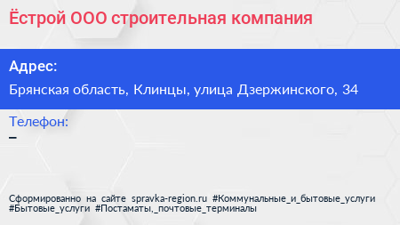 Ёстрой, ООО, строительная компания по адресу Брянская область, Клинцы, улица Дзержинского, 34 в дальнейшем Организация, размещена в следующих категориях: