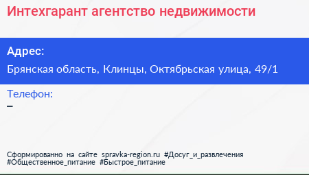 Интехгарант, агентство недвижимости по адресу Брянская область, Клинцы, Октябрьская улица, 49/1 в дальнейшем Организация, размещена в следующих категориях: