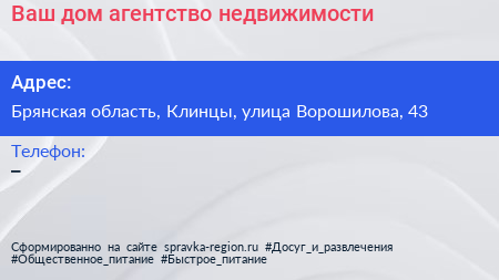 Ваш дом, агентство недвижимости по адресу Брянская область, Клинцы, улица Ворошилова, 43 в дальнейшем Организация, размещена в следующих категориях: