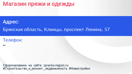 Магазин пряжи и одежды по адресу Брянская область, Клинцы, проспект Ленина, 57 в дальнейшем Организация, размещена в следующих категориях: