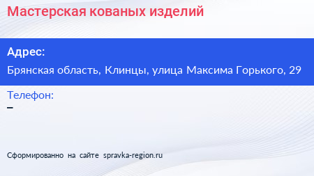 Мастерская кованых изделий по адресу Брянская область, Клинцы, улица Максима Горького, 29 в дальнейшем Организация, размещена в следующих категориях:
