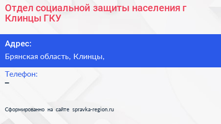 Отдел социальной защиты населения г. Клинцы, ГКУ по адресу Брянская область, Клинцы, в дальнейшем Организация, размещена в следующих категориях: