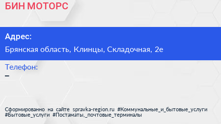 БИН МОТОРС по адресу Брянская область, Клинцы, Складочная, 2е в дальнейшем Организация, размещена в следующих категориях: