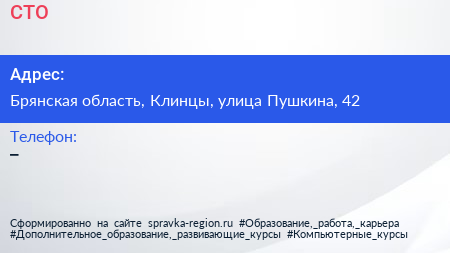 СТО по адресу Брянская область, Клинцы, улица Пушкина, 42 в дальнейшем Организация, размещена в следующих категориях: