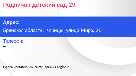 Родничок, детский сад №29 по адресу Брянская область, Клинцы, улица Мира, 91 в дальнейшем Организация, размещена в следующих категориях: