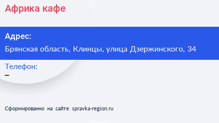 Африка, кафе по адресу Брянская область, Клинцы, улица Дзержинского, 34 в дальнейшем Организация, размещена в следующих категориях: