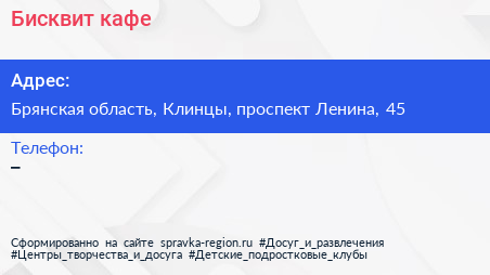 Бисквит, кафе по адресу Брянская область, Клинцы, проспект Ленина, 45 в дальнейшем Организация, размещена в следующих категориях: