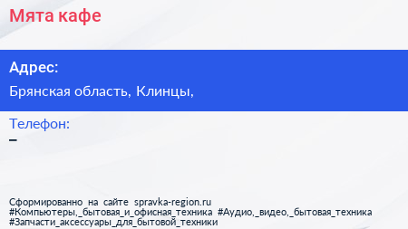 Мята, кафе по адресу Брянская область, Клинцы, в дальнейшем Организация, размещена в следующих категориях: