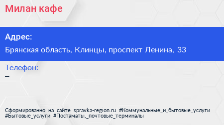 Милан, кафе по адресу Брянская область, Клинцы, проспект Ленина, 33 в дальнейшем Организация, размещена в следующих категориях: