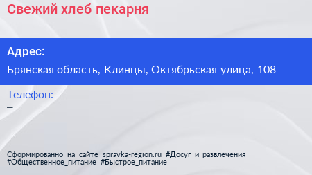 Свежий хлеб, пекарня по адресу Брянская область, Клинцы, Октябрьская улица, 108 в дальнейшем Организация, размещена в следующих категориях: